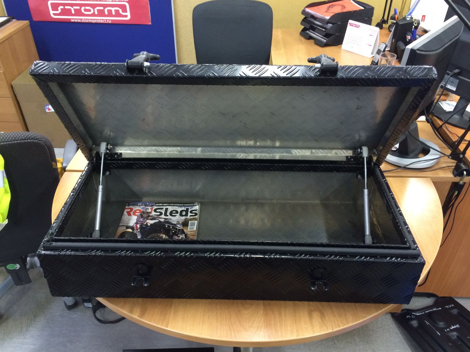 Кофр имеет газовые упоры для удобного открывания и поддержания крышки в