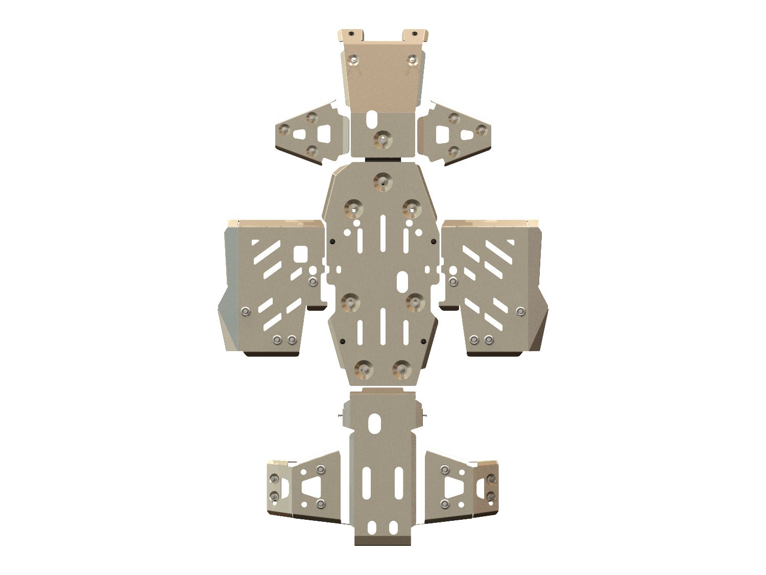 Полный комплект защиты включает защиту днища, рычагов и порогов. Предусмотрены отверстия для крепления переходной площадки отвала.