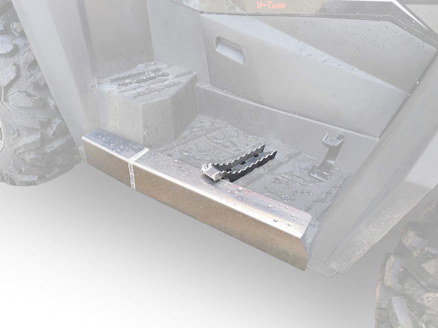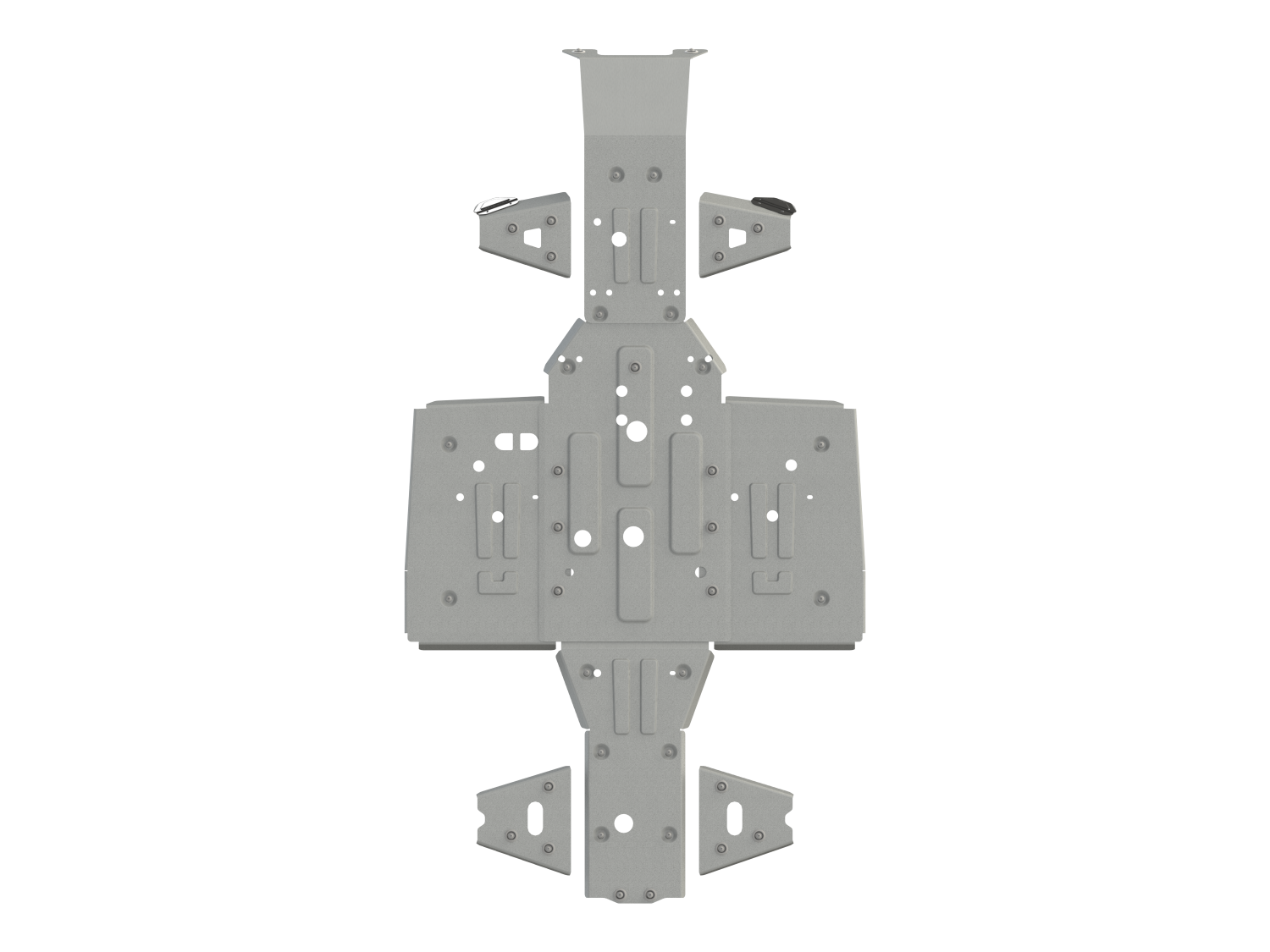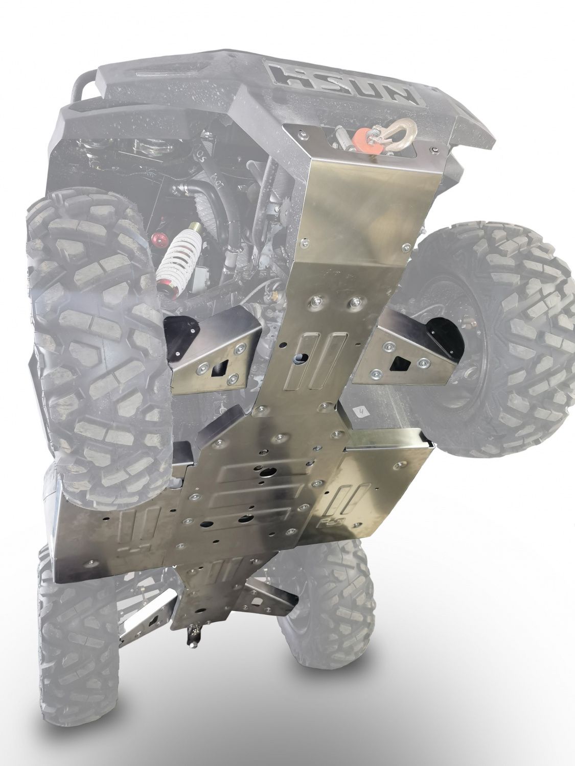 Защита из прочного и легкого алюминия надежно защитит раму и узлы квадроцикла от повреждений. Обнижения в местах крепления препятствуют срезанию болтов при пересечении препятствий, дополнительные штампованные ребра жесткости увеличивают прочность защиты. Дополнительные пластиковые лепестки на защите передних рычагов более надежно защищают наружные пыльники ШРУСов от палок и веток.