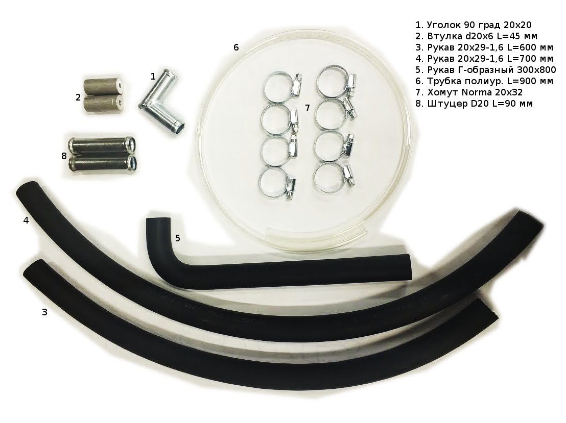 Универсальный комплект подключения радиатора: - уголок 90 град 20х20 - втулка d20x6 l=45 мм - рукав 20х29 l=600 mm - рукав 20х29 l=700 mm - рукав Г- образный 300х800 - трубка полиуретановая l=900 мм - хомут Norma 20x32 - штуцер d20 l=90 mm
